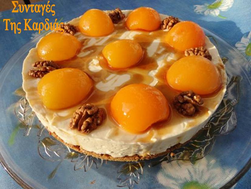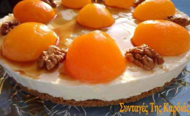Βάζουμε τα βερίκοκα να στραγγίσουν από το σιρόπι, σε απορροφητικό χαρτί. Στολίζουμε το γλυκό μας με τα βερίκοκα και τα μισά καρύδια.