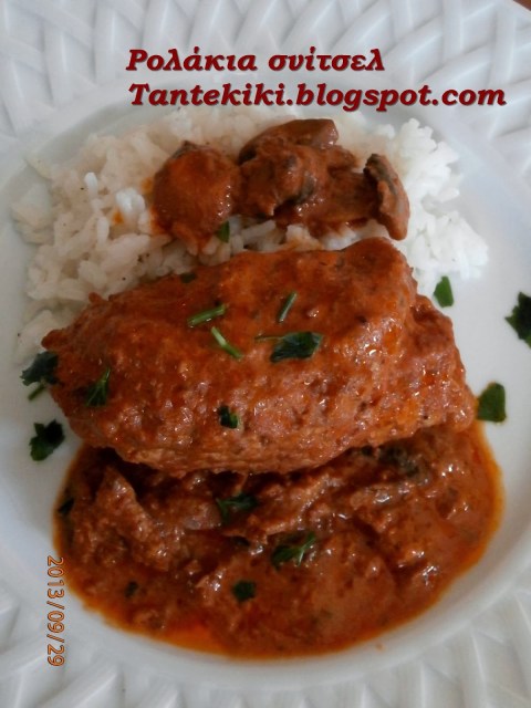 Σνίτσελ χοιρινό, τυλιγμένο σε ρολό, γεμάτο με τυρί, ζαμπόν και μανιτάρια μέσα σε μια κατακόκκινη θάλασσα από σάλτσα ντομάτας «παντρεμένη» με τυρί-κρέμα και φέτες από κάτασπρα φρέσκα μανιτάρια.