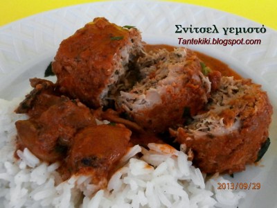 Απλώνουμε λίγη γέμιση και τυλίγουμε το σνίτσελ.
