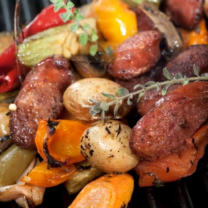 Μέσα σε μια μπασινα κόβουμε τα λαχανικά σε χοντρά κομμάτια. Χαράζουμε το λουκάνικο και βάζουμε το σκόρδο, το δεντρολίβανο, το ελαιόλαδο, το χυμό από το πορτοκάλι, το τσιλι και αλατίζουμε .