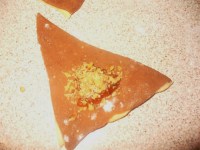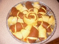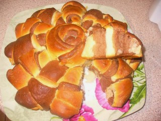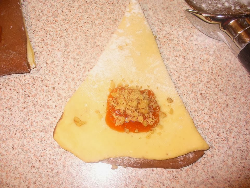 - Παίρνουμε ένα ένα τα κομμάτια,βάζουμε απο 1 κουταλάκι μαρμελάδα(εναλλάξ μια η καφέ ζύμη επάνω και μια η ασπρη) που την έχουμε ανακατέψει με τα ξύσματα,πασπαλίζουμε με λίγο φιστίκι ή καρύδι και τυλίγουμε όπως τα κρουασάν απο την φαρδιά μεριά προς τη στενή