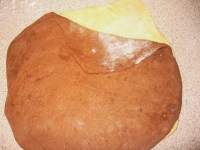 - Παίρνουμε την άσπρη ζύμη και σε αλευρωμένη επιφάνεια με την βοήθεια πλάστη ανοίγουμε ένα φύλλο στρογγυλό.Το ίδιο κάνουμε και με την ζύμη με το κακάο