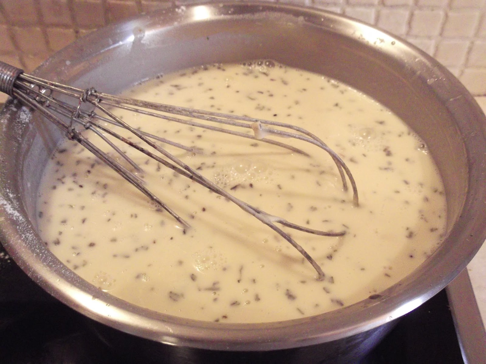 - Σβήνουμε με το υπόλοιπο κρασί και προσθέτουμε το νερό ή ζωμο,την κρέμα γάλακτος,τον βασιλικό και σιγοβράζω μέχρι να γίνει μια ωραία ελαφριά μπεσαμέλ