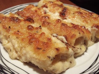 - Τα τοποθετούμε στο πυρέξ περιχύνουμε με την υπόλοιπη μπεσαμέλ και πασπαλίζουμε με την υπόλοιπη παρμεζάνα
