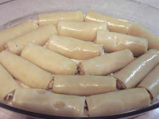 - Παίρνουμε ένα λαζάνι,βάζουμε γέμιση στην άκρη του και τυλίγουμε σε ρολό.Κάνουμε την ίδια διαδικασία και με τα υπόλοιπα λαζάνια