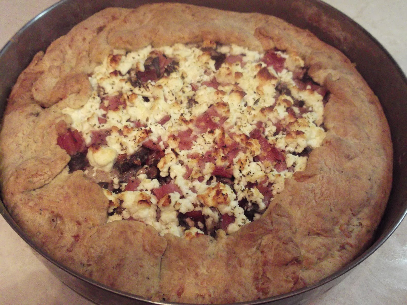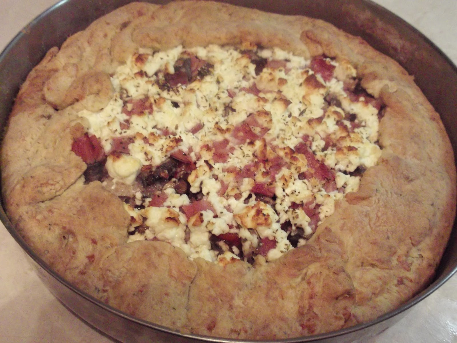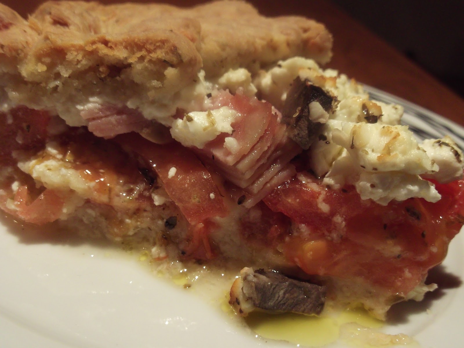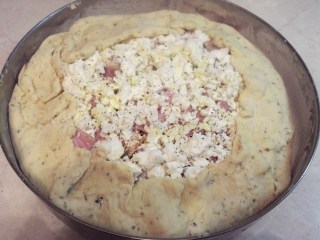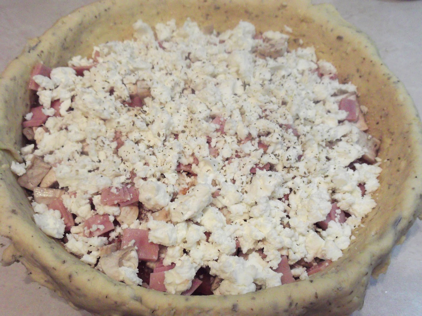 - Από πάνω προσθέτουμε όλα τα υλικά της αρεσκείας μας,τελειώνουμε με την τριμμένη φέτα,ρίχνουμε λίγο ελαιόλαδο και γυρνάμε το φύλλο που έχει περισσέψει προς τα πάνω