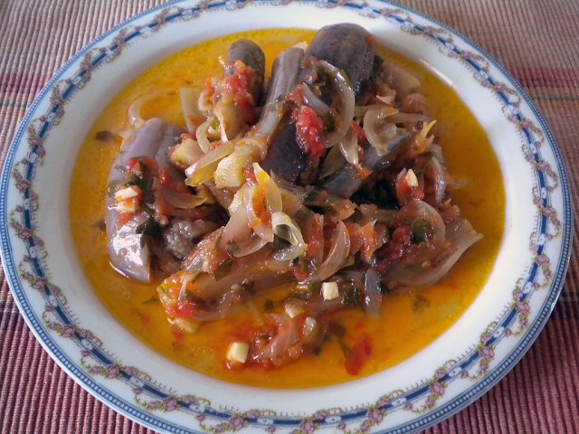 Σήμερα το μενού περιλαμβάνει ένα παραδοσιακό πιάτο της τούρκικης κουζίνας με τις γεμιστές μελιτζάνες με κρεμμύδια σε κόκκινη σάλτσα που πέρασε σε εμάς μέσω της κουζίνας των Ελλήνων της Κωνσταντινούπολης και της Μικράς Ασίας. Όμως εμείς παρουσιάζουμε την εκδοχή τη δική μας η οποία είναι πιο ελαφριά και υγιεινή από την αυθεντική, πιο απλή στην παρασκευή (αφού δε γεμίζουμε καν τις μελιτζάνες) και έχει ένα μικρό πλεονέκτημα ακόμα. Τη φτιάχνουμε με τσακώνικες μελιτζάνες και όχι με φλάσκες. Η τσακώνικη μελιτζάνα παράγεται στο Λεωνίδιο Λακωνίας και είναι προϊόν ΠΟΠ (Προστατευόμενης Ονομασίας Προέλευσης). Η γλύκα της δε συγκρίνεται με τις υπόλοιπες μελιτζάνες. Είμαστε όπως βλέπετε τυχεροί που εδώ στην Καλαμάτα είμαστε κοντά στον τόπο παραγωγής τους, καθώς η ίδια ποικιλία μελιτζάνας καλλιεργημένη σε άλλο μέρος δεν έχει την ίδια χαρακτηριστική γλυκιά γεύση! Αναζητήστε τη. Αξίζει πραγματικά!