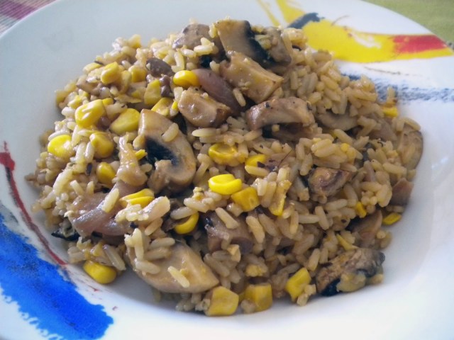 Σε κατσαρόλα με λίγο ελαιόλαδο σοτάρω τα πρώτα έξι υλικά μέχρι να σκορπίσουν το άρωμά τους. Προσθέτω τα κρεμμύδια και σοτάρω μέχρι να μαλακώσουν. Προσθέτω τα μανιτάρια, τον κουρκουμά, το πιπέρι καγιέν, το σκόρδο και το τζίντζερ και ανακατεύω καλά. Προσθέτω το καλαμπόκι, ανακατεύω καλά, προσθέτω το ρύζι και ανακατεύω καλά να λαδωθεί και αυτό. Προσθέτω 2,25 φλ. νερό, το γιαούρτι, το δυόσμο, το σαφράν και το γκαράμ μασάλα και βράζω σε σιγανή φωτιά με κλειστό το καπάκι για περίπου 10′ ή μέχρι να απορροφηθεί όλο το νερό. Κατεβάζω από τη φωτιά και αφήνω το καπάκι κλειστό για ακόμα 10′ πριν σερβίρω.