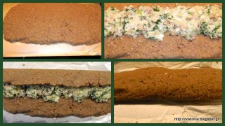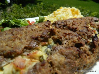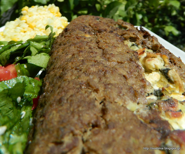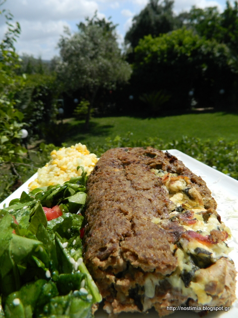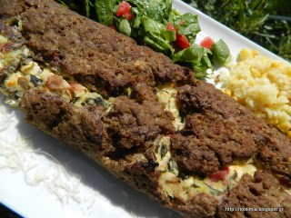In a food processor pulse onion, garlic, zucchini, olive oil and milk. In a bowl mix all these ingredients with minced meat, crumbled rusks and egg white. Knead this dough. In a frying pan put mushrooms and 3-4 Tbsp water and let cook. When liquid is evaporated, add bacon and spinach and stir for 3-4 minutes. In a bowl mix the ingredients cooked in the pan with potato and feta crumbles. Spread this minced meat mixture on a baking parchment and spread the filling in the middle as shown in the pictures above. Wrap the meatloaf. Bake in preheated oven at 180 C for 30 minutes wrapped in the baking parchment and then unwrap it and bake for another15 minutes until golden brown. Let cool before serving. Enjoy!