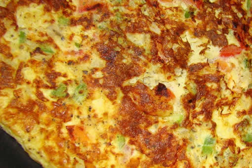 6. Αφήνουμε να ψηθεί η ομελέτα για 1’ και μοιράζουμε σε όλη την επιφάνεια το ρεγκάτο. Μετά από περίπου 4’ ελέγχουμε αν έχει ψηθεί από την μία μεριά. Αν έχει ψηθεί με την βοήθεια ενός μεγάλου πιάτου γυρνάμε την ομελέτα και την αφήνουμε να ψηθεί και από την άλλη.