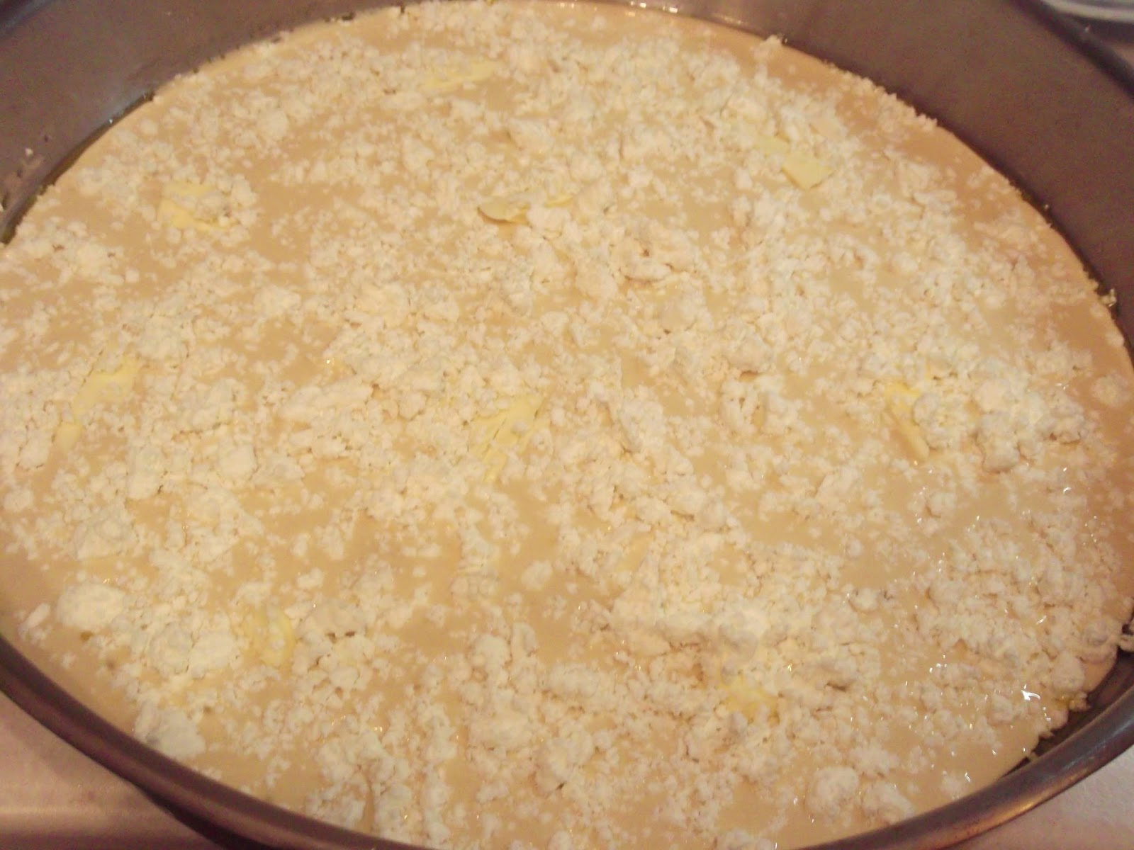 - Ρίχνουμε το μείγμα σε ένα καλά βουτυρωμένο ταψί και το απλώνουμε να πάει παντού