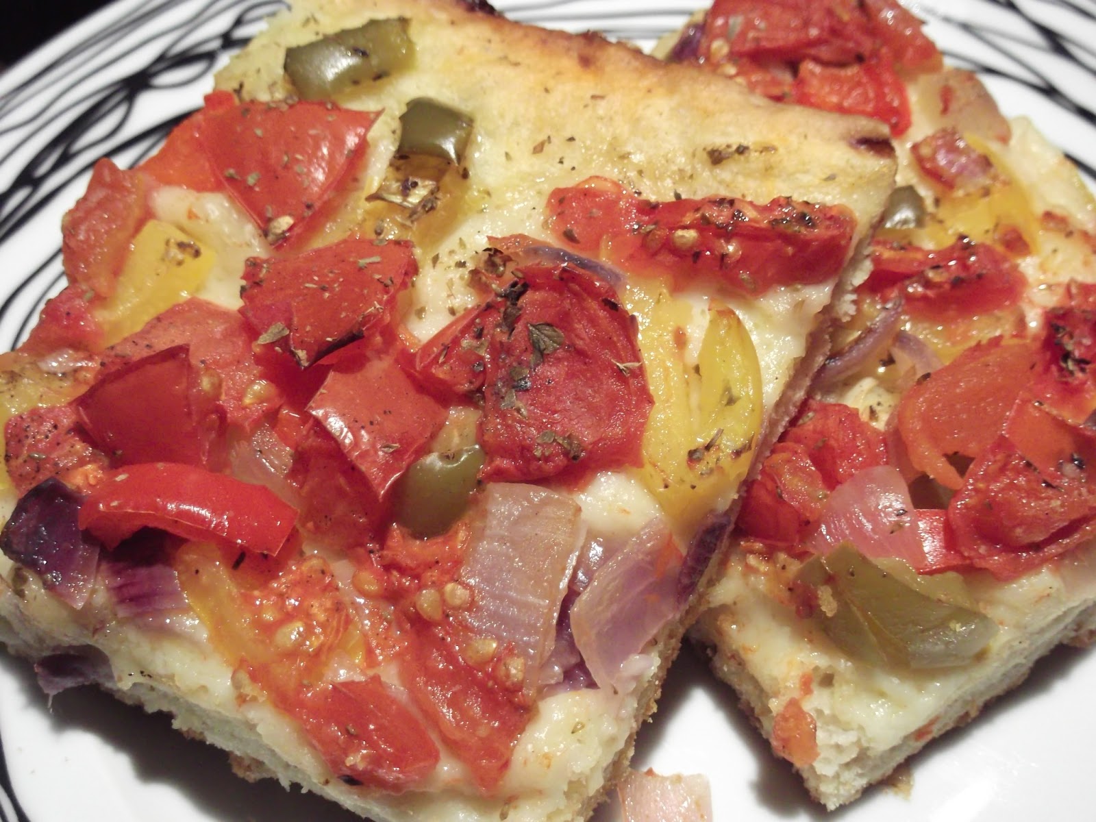 - Τοποθετούμε απο πάνω τις ντομάτες,τα κρεμμύδια,τις πιπεριές,τις ελιές,αλατοπιπερώνουμε καιπασπαλίζουμε με ρίγανη