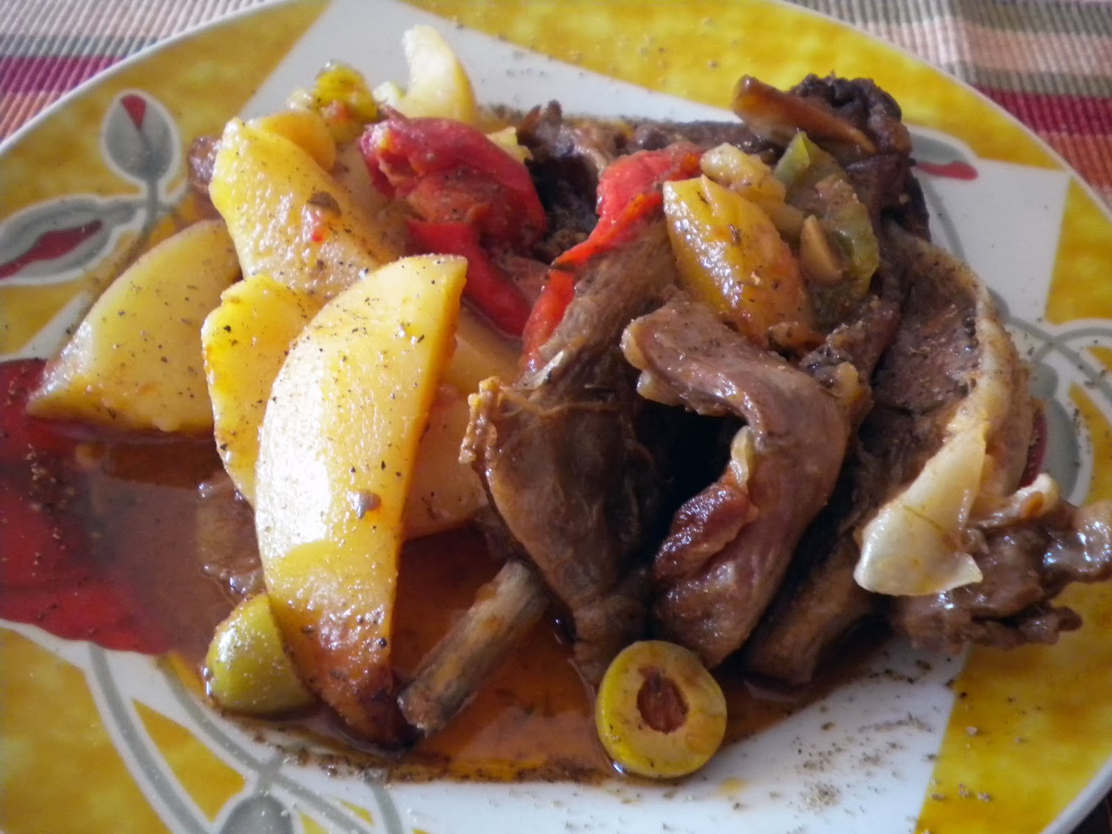 - Προσθέτω το κρέας με το ζουμί του μαζί με όλα τα υπόλοιπα υλικά, εκτός από τις ελιές, σε γάστρα και λίγο επιπλέον νερό (περίπου 1 φλ.) και ψήνω σε προθερμασμένο φούρνο στους 180°C για 2,5 ώρες. Έπειτα προσθέτω τις ελιές και συνεχίζω το ψήσιμο για 30′ ακόμα. Σερβίρω με φρεσκοτριμμένο πιπέρι.